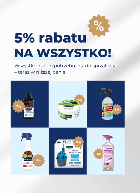 Interesują Cię skuteczne, przystępne cenowo środki czystości? Sklep internetowy Starwax to wszystko, czego potrzebujesz! Jesteśmy jedyną marką, która oferuje kompletną gamę środków czystości oraz akcesoriów do czyszczenia i konserwacji domu.